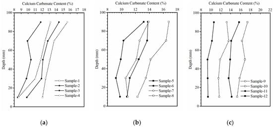 Quantification calcium carbonate contents along the height of solidified sand specimens: (a) 75–150 μm; (b) 150–300 μm; (c) 300–600 μm.