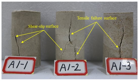 Under unconfined compression strength conditions, the failure modes of sand columns were divided into tensile failure, shear columns, and tensile-shear composite failure []. As shown in Figure 8, the test results of the UCS of MICP-treated sand samples presented that almost all the failure modes were tensile–shear composite failure, which was mainly manifested as the damage had legible tensile failure surface and shear-slip surface. The main crack was dominated by the tensile failure surface.