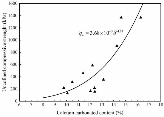 The relationship between unconfined compressive strength qu and calcium carbonate content in the column is presented in Figure 9. The unconfined compressive strength qu improved with the increase of average calcium carbonate content in the sand column, which verified the research of Qabany [] and Duo [] that calcium carbonate content was positively correlated with the mechanical strength of the bio-treated sand column. The calcium carbonate content in the solidified sand column can be used to estimate the UCS value qu of the sample to some extent.