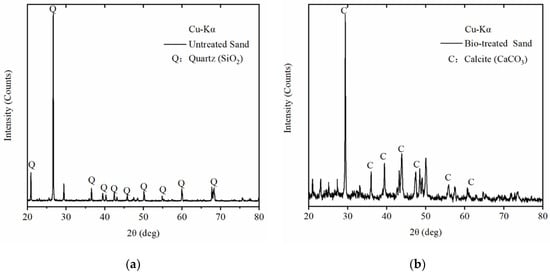 The XRD analysis and SEM observation provided trustworthy evidences on the precipitation of calcium carbonate from MICP mineralization. Figure 10a,b illustrate XRD spectrum peaks intensity of diffraction angle for untreated and bio-treated sand specimen, respectively. The main components of the tested sand column were quartz (SiO2) and calcite (CaCO3), respectively. The calcium bicarbonate Ca(HCO3)2 and ammonium chloride (NH4Cl) are the other products that could potentially form, besides calcium carbonate. Quartz was the main mineral component in the original sand, and calcite was a new cementitious chemical composition obtained after bio-treatment with MICP technology, which was also the fundamental reason why the bio-treated column gained a certain mechanical strength [,]. This was done to confirm that the crystals observed in the images were actually CaCO3 precipitated on the silica sand and to detect whether there were any other elements in the column samples after the precipitation process.