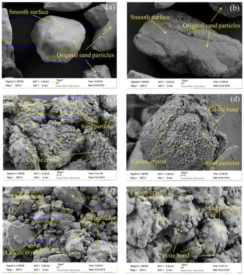 Based on the performance of the above macroscopic mechanical tests, lower concentration of cementation reagent and more injection cycles resulted in samples with more pores filled, higher calcium carbonate content and greater mechanical strength. This indicated that the concentration of cementation reagent had a potential effect on the microstructure of sand column. Differences in the distribution of calcium carbonate crystals (sand particle size: 300–600 μm) were observed obviously on SEM image, as shown in Figure 11a–f. Each sample was photographed several times in order to exclude the randomness of experimental observation. As shown in Figure 11a,b, the original sand particles had a smooth surface. Both bio-treated specimen at cementation reagent of 0.5 M and 1.5 M showed that the abundant calcite (CaCO3) crystals were filled at the contact point and covered the surfaces of the sand particles.