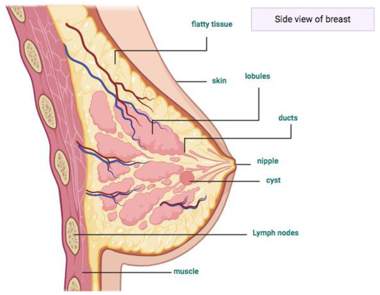 To understand breast cancer, some basic knowledge about the normal structure of the breast is important. Women’s breasts are constructed of lobules, ducts, nipples, and fatty tissues (Figure 1) [5]. Normally, epithelial tumors grow inside the lobes, as well as in the ducts, and later form a lump [6], generating breast cancer.