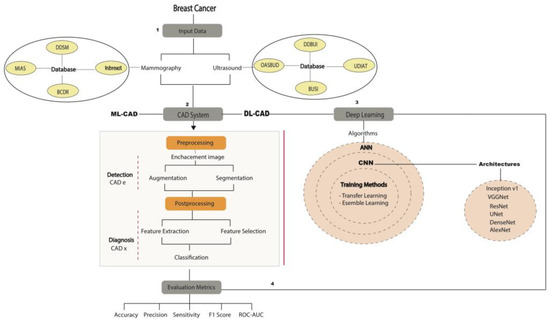 The general modern DL-CAD design was divided into four sections (Figure 4). First, different mammography and ultrasound public digital databases were analyzed as input data for the DL-CAD system. The second section includes the preprocessing and postprocessing in the next-generation DL-CAD.