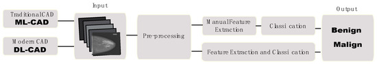 The CAD systems are divided into two categories. One is the traditional CAD system and the other is the DL-CAD system (Figure 5). In the traditional CAD system, the radiologist or clinician defines features in the image, where there can be problems regarding recognizing the shape and density information of the cancerous area. A DL-CAD system, on the other hand, creates such features by itself through the learning process [74].