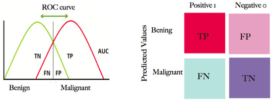 Confusion matrix for a binary classifier that is used to distinguish between two classes, namely, benign and malignant. TP: true positive; FN: false negative, FP: false positive, TN: true negative, TPR: true positive rate, FPR: false positive rate.