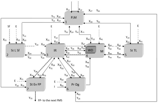 The diagram shows all the component subsystems, all inputs and outputs and, all couplings. The notations of FMS subsystems components correspond to the layout of the system. Thus, in the scheme of Figure 3, the FMS processing subsystems components of items were numbered from 1 to 7. The subsystem process management (PrM) coordinates all component subsystems: IR—Industrial robot; M—Machine tool; WD—Working device; StTL—Tool supply station; StLSf—Semi-finished delivery station; PrDg—Process Diagnosis; StEvFP—Finished product evacuation station. All information couplings are of a two-way type.