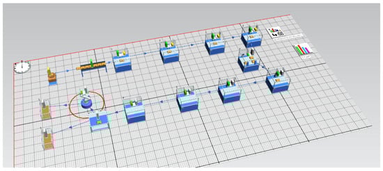 So far, the existence of asynchronous and concurrent events in a complex system, such as FMS, has made the number of its modeling techniques relatively small. However, the use of simulation techniques in the field of complex dynamical systems, including FMS, is currently widespread [46,47]. The evolution of the system over time can be described by complex algorithms or procedures, which best describe the operation in real time. The dynamic structure of the simulation introduces time into the operation of the model. This is necessary to place objects in real time and to allow progress in time from one state of the system to another state. Computer modeling and simulation allow the visualization and forecasting of the performance of a system with lower costs than when using other methods. Different processing scenarios through virtual modeling and simulations and the choice of the optimal variant are described in the paper [48].