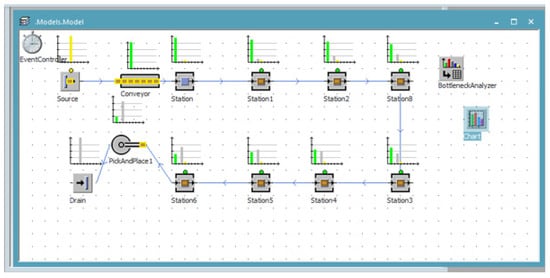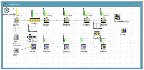 By running simulations considering another scenario of real-time operation, improvements can be achieved. This solution has produced favorable effects in terms of balancing the production line, trying to equalize the load of workstations and ensuring a continuous flow of production (Figure 9). At this stage, in order to simplify the process, neither the input sources of the parts in the system (Source) nor the output sources of the system (Drain) were taken into account.