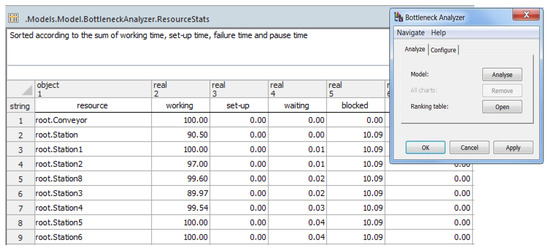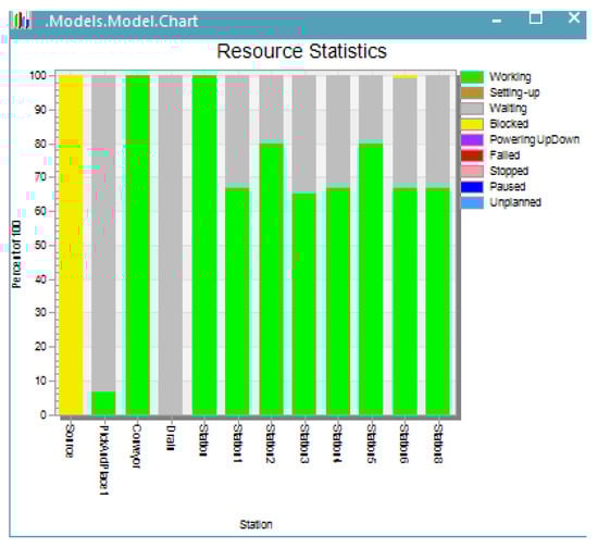 Figure 10 shows statistics obtained from optimization by increasing the working times on each workstation and by reducing the wait times in the production process. It can be seen that all of the workstations in the system work at maximum capacity (90–100%). By running the simulation and by balancing the system using several scenarios, visible improvements were obtained in terms of blockage rate and workstation loading. The presented simulation program also performs animation features of movements carried out into the flexible manufacturing line. All material flow objects and all moving objects enter their statistics values into the Resource Statistics Table, the Product Statistics Table, or the Complete Statistics Table (Siemens AG 2015, Siemens Product Lifecycle Management Software Inc., Germany [44]).