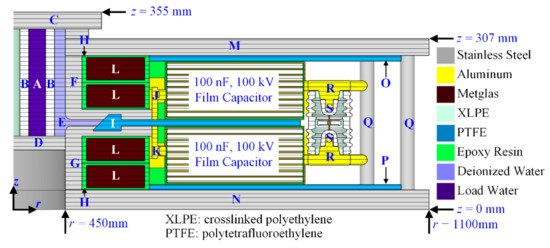 Cross-sectional view (r-z plane in cylindrical coordinate system) of the newly developed single-stage FLTD. A: load cavity filled with water solution, B: insulating barrier of the load, C: load cavity top lid, D: load cavity bottom lid, E: deionized water-filled cavity, F: negative output electrode, G: positive output electrode, H: epoxy resin casings for magnetic cores, I: middle insulator, J: negative capacitor mounting bracket, K: positive capacitor mounting bracket, L: four separate rings of the magnetic core, M: top lid of FLTD cavity, N: bottom lid of FLTD cavity, O: top insulator, P: bottom insulator, Q: separate columns (24 in total), R: switch terminals, S: switch electrodes.