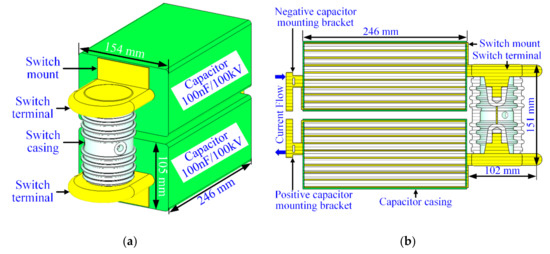 Figure 13 shows the short-circuit current waveform of a single discharging brick under experiment and simulation, which demonstrates good agreement with each other. The equivalent inductance and resistance can be calculated to be 160.1 nH and 0.3 Ω. Figure 14, Figure 15 and Figure 16 show the current path (current density vector), electric field intensity vector, and magnetic field intensity vector at the instant of maximum short-circuit discharging current of the two brick models. The current path of the two brick models is clearly very different because of the conductor shape in film capacitors. Most of the electric field distributes along the axial direction in the two brick models. However, the distributions in the regions of switch terminals and middle insulator demonstrate some differences, as shown in Figure 15. The magnetic field entirely along the azimuthal direction and the distribution pattern between the two brick models is very close. Although the two models have different current path, their short-circuit discharging current waveforms are in good agreement as depicted in Figure 13, because of the same equivalent electrical parameters in the field-circuit coupling models.