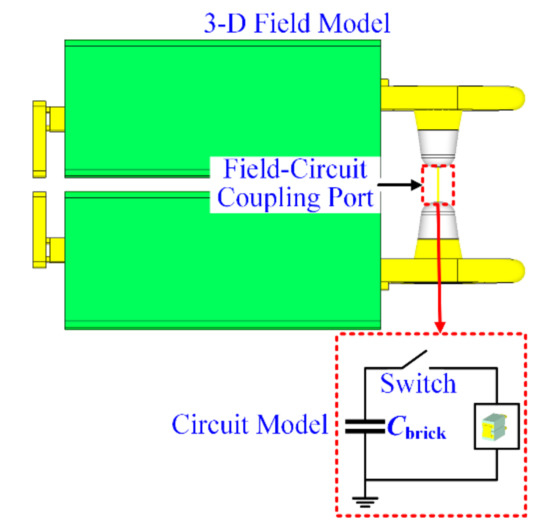 According to equivalent circuit model and measured results, capacitance, inductance, and resistance of a main discharging brick are 50 nF, 160 nH, and 0.3 Ω, respectively. We construct the 3-D model of a discharging brick to represent only its equivalent inductance and resistance, while its capacitance and initial voltage is represented by a lumped element in the circuit model. As shown in Figure 6, through finite element analysis, we can determine inductance and resistance of the brick model to be 160 nH and 0.3 Ω, respectively. The field model and circuit model are coupled through the conduction path of gas switch, as illustrated in Figure 7. The equivalent capacitance of the brick is modeled in circuit and it should be exactly 50 nF (two series-connected 100 nF capacitors).