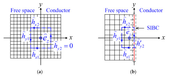 Under the influence of a pulsed current with rise-time less than 100 ns, the skin depth of good conductors in the FLTD cavity is very small, leading to a rather short length of spatial step to accommodate the fast-changing field. As depicted in Figure 10, by using the SIBC, EM field distribution on the surface of conductors can be obtained without calculating the internal field distribution of the medium [40]. Therefore, introduction of the first-order SIBC in TD-FIT can effectively reduce the number of DoFs.