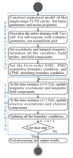 During the simulation, equivalent capacitance value of a single discharging brick is 50 nF and the initial charging voltage is 200 kV (±100 kV for each capacitor). The load resistance is set to 0.1 Ω. In FLTD cavity region, the maximum grid length is set to 1/30 of wavelength, while in the background region, the maximum grid length is set to 1/10 of wavelength. The obtained number of hexahedral primal grid of the single-stage FLTD with 24-separate columns is 5,116,608. The perfect magnetic conductor (PMC) boundary condition is implemented along the cut-plane because the FLTD cavity is symmetric along this direction. Outer boundary of the computational domain is the convolution perfectly matched layer (CPML) absorbing boundary condition and in every axis direction there are four cells. The flow chart including all the steps in the field-circuit coupled simulation is illustrated in Figure 11. All the simulations are accomplished by MATLAB and CST Studio Suite.