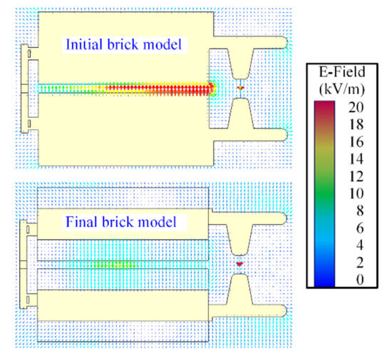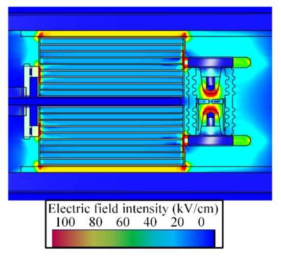 Electric field intensity distribution when the two capacitors in a brick are initially charged to ±100 kV and the switch has not been triggered is shown in Figure 12. The electric field between the plus electrode and minus electrode is uniformly distributed and field intensity around edge of the electrode is lower than that of the middle part. Because the construction details of capacitors are not included in the field model, the fringe electric field intensity around the capacitors is obviously not a precise representation of the actual electric field around the physical capacitors.