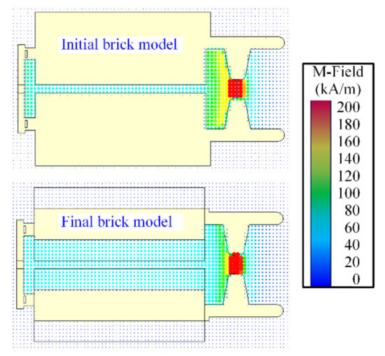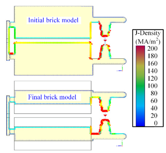 To achieve the required electrical parameters and field distribution outside the brick, a genetic algorithm is used to optimize the shape and size of the internal equivalent conductor of the film capacitor. The final simplified model is shown in Figure 8. The main differences between the initial model and final model are the internal structure of film capacitor. However, they will exhibit the same brick discharge current due to the same electrical parameters. As can be observed from Figure 8, the current flow path and field distribution inside the capacitors will be different from those of the initial model. This is the tradeoff between accuracy and speed in our numerical calculation.
