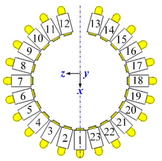 When all the 23 discharging bricks in the same FLTD cavity begin to release the stored energy in the capacitors, due to the discharge current flow direction, all the mutual flux-linkages among different discharging bricks have the azimuthal direction, resulting in the increased total equivalent inductance of the discharging bricks. As depicted in Figure 17, the bricks No. 2 to 12 are symmetric to the bricks No. 23 to 13. Thus, only inductances of No. 1 to 12 bricks are calculated in simulation and the results are tabulated in Table 2.