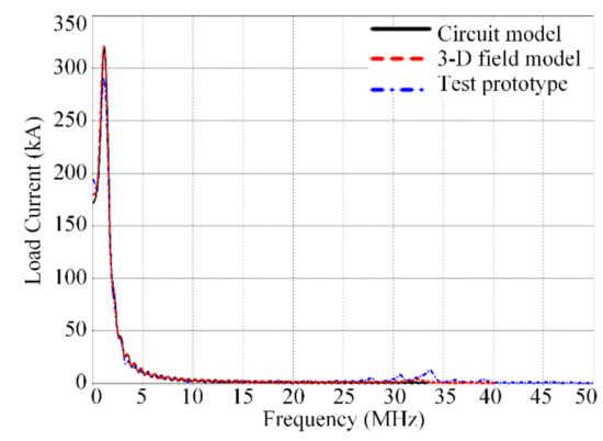 Figure 18 depicts load current generated by the experimental prototype, 3-D field model, and circuit model. In both simulations and experiments, the two capacitors in a discharging brick are charged to ±80 kV and the load resistance is set to 0.05 Ω. The rise time (10% to 90%) and amplitude of the load current is ~110 ns and ~950 kA, respectively. Thus, the MA-class single stage FLTD with 24-separate columns can generate required output current for the multi-stage series-connected FLTD module. By using the fast Fourier transform (FFT), the load current waveforms can be transformed from time domain to frequency domain, as illustrated in Figure 19. The simulated waveforms are in accordance with the experiment results except for low frequencies between 0–0.5 MHz and high frequencies between 26–35 MHz. Most of the spectral components of load current are in the range of 0 to 5 MHz. The discrepancies between simulations and measurements in the high frequency range are probably the effects of stray capacitances in the FLTD cavity. As shown in Figure 20, bricks’ discharge currents demonstrate that brick no. 12 has the smallest rise time and highest peak value, which conform to the smallest equivalent inductance of brick no. 12 in Table 2. Moreover, the circuit-field coupled TD-FIT only needs 3 h, 32 min calculation time and 3.7 GB memory consumption to complete the whole simulation. This is efficient to the 3-D time-domain simulation with over 10 million DoFs.