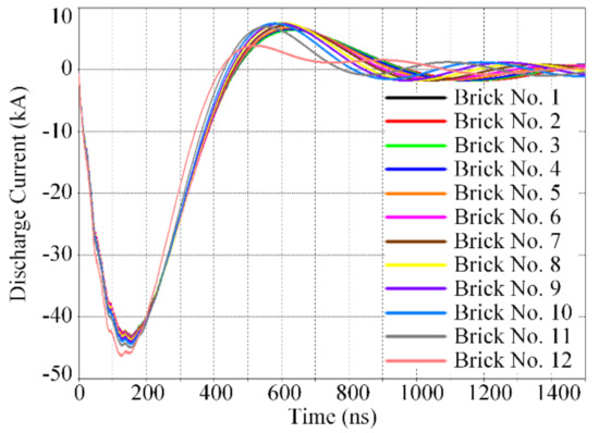 The most important performance parameters of a discharging brick are amplitude and rise time of discharging current. In addition, the equivalent electrical parameters, peak current, and physical size of a brick determines the overall electrical performance of FLTD. The current of the single discharging brick is measured and simulated via the short-circuit discharge method. Equivalent inductance and resistance are obtained from the current waveform: