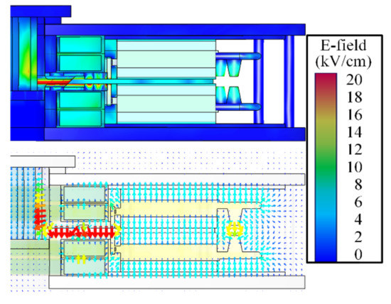 The cross-sectional view of electric- and magnetic-field intensity distributions at the time instant of maximum load voltage and load current are illustrated in Figure 21 and Figure 22, respectively. The electric field mainly distributes along the axial direction in the primary side and radial direction in the secondary side, whereas the magnetic field distributes along the azimuthal direction in both the primary and secondary sides. The EM wave propagates along the axial direction in the de-ionized water insulated transmission line of the secondary side of FLTD cavity, thus it operates in the transverse EM (TEM) wave mode. The highest magnitude of electric field intensity is now located near the narrow water-insulator interface region. The leakage magnetic flux is located in the middle insulator and the region of deionized water, which conforms to the theoretical analysis.