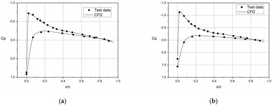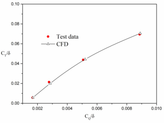 Figure 5 shows that the pressure coefficient distribution at 0.96R on the blade surface obtained by CFD simulation fits well with the test data. To further verify the accuracy of the simulation, the thrust coefficient obtained by the simulation was compared with the test data, as shown in Figure 6: