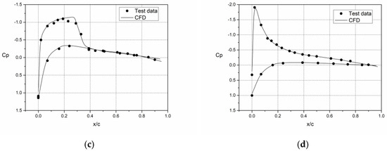 In order to verify the accuracy of the CFD method proposed in this paper, four working conditions with comprehensive test data were selected from the test report. They are: (1) , , , ; (2) , , , ; (3) , , , ; (4) , , , . Where, is the Mach number at the blade tip, is the total pitch, is the rotation speed, and is the thrust coefficient of the rotor.