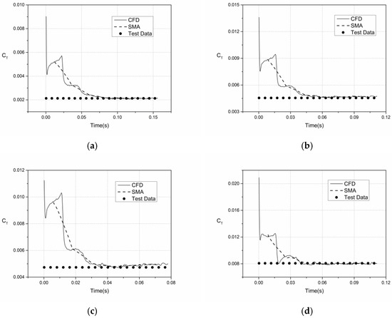 C-T rotor thrust coefficient curve with physical time. (a) , . (b) , . (c) , . (d) , .