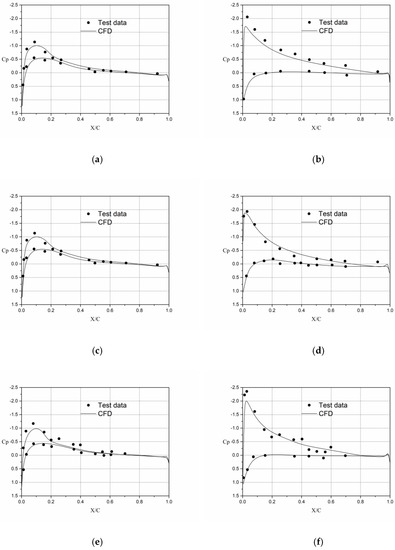 Figure 5 shows the comparison between the pressure coefficient at 0.96R obtained by CFD simulation and the test data. It can be seen from this figure that the pressure coefficient distribution at 0.96R on the blade surface obtained by CFD simulation fits well with the test data.