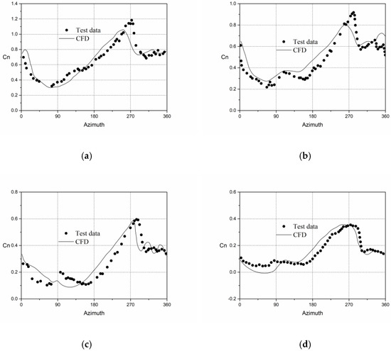 In Figure 9, the curves of normal force coefficient with azimuth angle at four different section positions on the blade calculated by CFD simulation are given and compared with the test data. According to the data in the figure, when the azimuth angle of the advancing blade is about 70° to 90° or the retreating blade is near an azimuth of about 270°, there will be strong blade/vortex interference, resulting in abrupt change of aerodynamic force in the blade section, which makes it more difficult to simulate the rotor flow field in forward flight state.