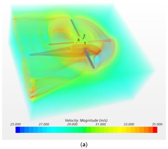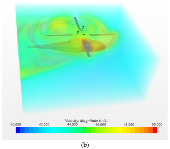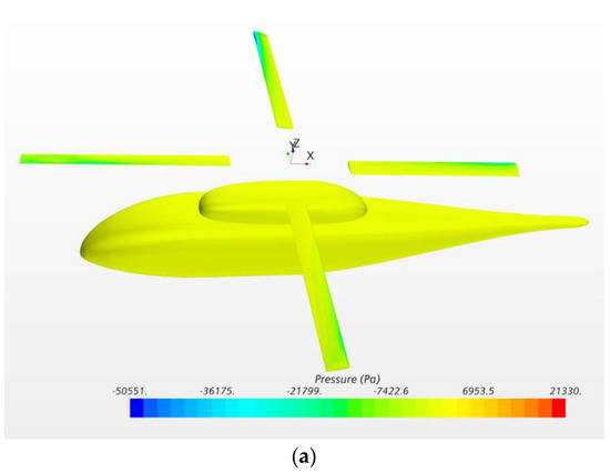 It can be seen from Figure 13 that the calculation values are consistent with the test data and the error is within the allowed range, thus proving that the CFD simulation method and the grid method proposed in this paper are suitable for the simulation of the interference flow field of coaxial rotors in hover and can achieve a high calculation accuracy.