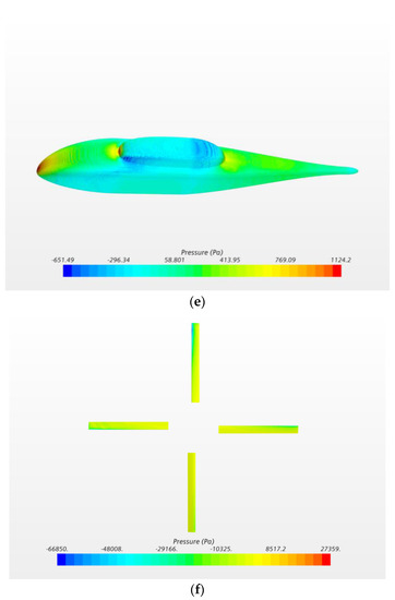 Figure 10 shows the velocity contours of the Robin fuselage/rotor interference flow field within the main flow velocity range at a certain time. As the blades are in motion, the velocity contours are dynamically changing. As can be seen from this figure, the Robin fuselage is within the downwash flow range of the rotor, so there must be mutual interference of the flow field between the rotor and the fuselage. Figure 11 shows the pressure contours corresponding to the moment. Since the pressure difference range of the blade is far greater than that of the fuselage, the pressure contours of the Robin fuselage are separately shown. Figure 10 and Figure 11 show the shock wave of the forward blade and the airflow separation phenomenon of the rear blade. With the increase of the forward ratio, the downward deflection of the rotor wake decreases, and the effect of downwash flow on the fuselage is weakened.