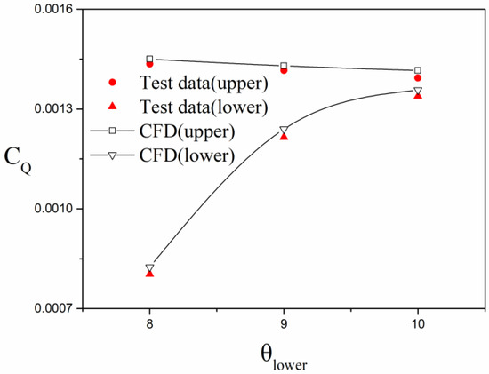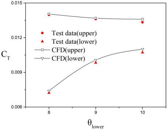 The rotor model of Section 3.4 continues to be adopted in this section, and only the distance between the upper and lower rotors is adjusted to 0.24 m. [31] The flow field of the coaxial rotor was calculated when the advance ratio was 0.08 and the collective pitches of the upper and lower blades were (9°, 8°), (9°, 9°), and (9°, 10°), and the thrust coefficient and moment coefficient of the calculated upper and lower rotor were compared with the test data, as shown in Figure 14 and Figure 15.