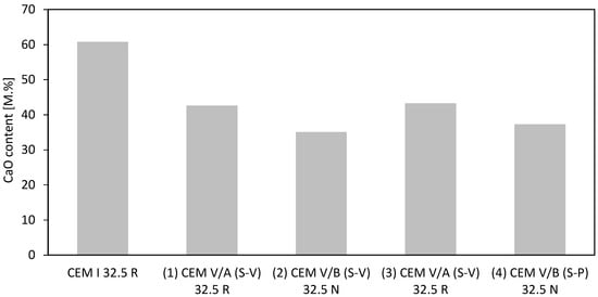 An important parameter with regard to chemical composition and environmental impact is the CaO-content of the various cement products. The lower the content of CaO, the lower the amount of ECO2 (see Section 1.1) emitted. On the other hand, the CaO-containing components in hydrated cement are most sensitive to any aggressive attack; therefore, reducing the CaO content in the blended cement is a key condition for the expected improvement in the durability of the cement composites, see Section 2.4. Figure 2 illustrates the CaO content derived by X-ray fluorescence.