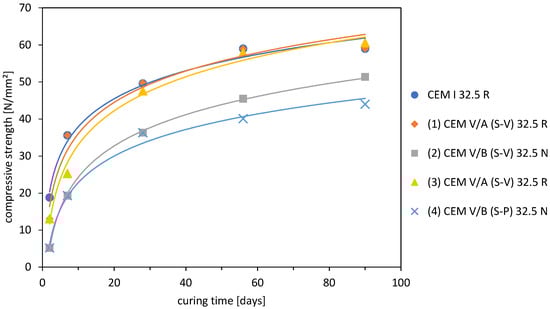Compressive strength development of standard mortar specimens according to [51] (each value as a mean value of 3 individual tests), after 2, 7, 28, 56, and 90 days.