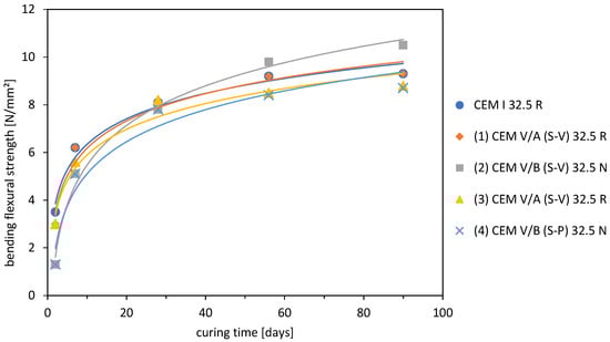 Bending flexural strength development of standard mortar prisms according to [51] (each value as mean value of 3 individual tests), after 2, 7, 28, 56, and 90 days.