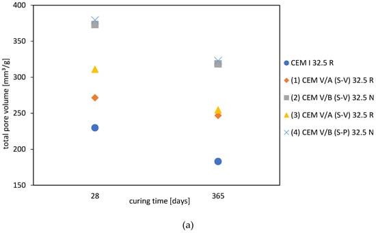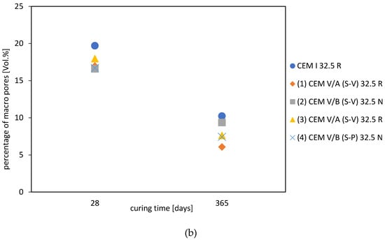 As illustrated in Figure 6, total porosity and percentage of macro-pores are clearly reduced during hydration of the Portland cement and—in the case of the CEM V cement types—the added cementitious constituents in the period from 28 to 365 days of curing. Therefore, CEM I 32.5 R shows clearly the lowest total porosity (Figure 7a) with CEM V/B cement types approximately having 1.5 times as much total pore volume. However, CEM I cement also has the highest amount of macro pores (Figure 6b) at 28 and 365 days of curing time, nevertheless—due to its comparably low total porosity and highest short-term reactivity (because of the highest clinker content and lack of latent hydraulic and pozzolanic additives)—showing the highest compressive strength at 28 days age compared to the CEM V cement types.
