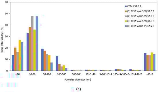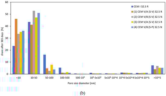 Comparison of pore-size distribution after 28 (a) and 365 days (b) curing time.