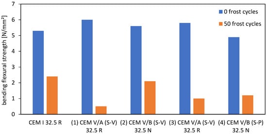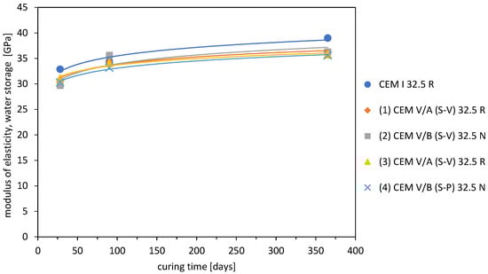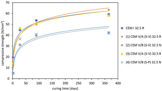 Considering bending flexural strength (Figure 5), all cement types reach a similar strength level after 28 days of water curing. Subsequently, cement type (2) CEM V/B (S-V) is the only cement type still exhibiting a significant increase in flexural bending strength.