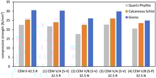 Figure 9 confirms the trend illustrated in Figure 6 (CEM V/B cement types show the lowest strength development after 28 days of curing time), additionally demonstrating the influence of the aggregate type: Quartz phyllite aggregate shows the lowest, calcareous schists aggregate shows mediocre, and gneiss aggregate shows the highest compressive strength due to rock characteristics, cf. [28].