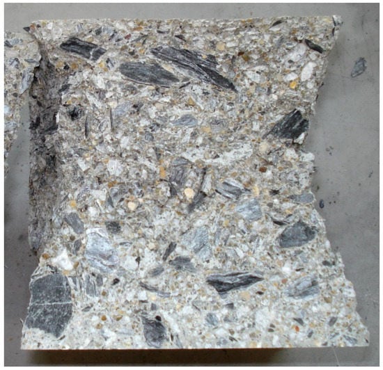 In a third step, (3) standard aggregate for concrete was replaced by recycled aggregate from nonstandard crushed metamorphic rock arising during tunnel excavation. These concrete mixtures—now consisting of a newly developed CEM V cement admixture and processed and recycled aggregate from schist rocks—were also examined with regard to workability (fresh concrete density, flow spread, air content), strength (compressive and bending tensile strength, as well as the fracture energy), and particularly with regard to durability, as the designed concrete composition may be used in tunnel constructions, where the recycled aggregate is generated, exhibiting long service lifetimes of up to 200 years.