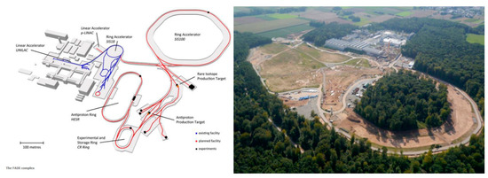 The layout of the Facility for Antiproton and Ion Research (FAIR; left) and a bird’s eye view of the construction place (right).