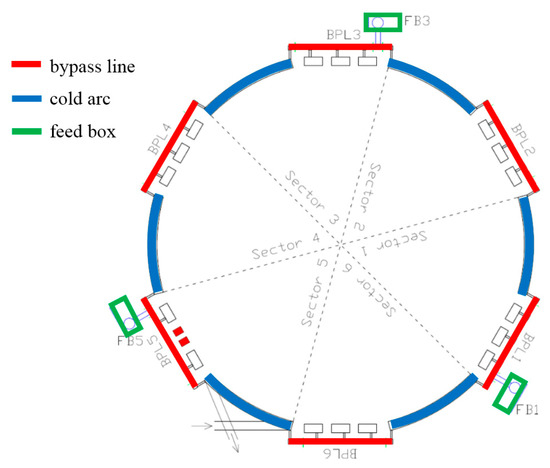 Schematic representation of the SIS100 accelerator showing the six bypass line (BPL) sections. The cold arc sections and BPL sections are for clarity and are not shown in proportion to each other. FB1, FB3, FB5—feed boxes.
