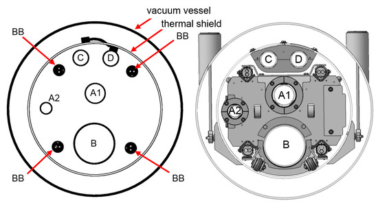 General cross-sectional layout of the SIS100 bypass line: without supports (left); with supports (right). A1, A2, B, C, D—helium process pipes, BB—superconducting busbars.