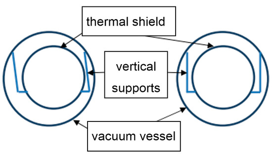Both upper ends of the loop pass through the holes in the vacuum vessel and are supported on rollers with an adjustment range in a vertical direction. The rollers provide the ability of self-balance of the forces in all lines of the aramid cord. Loops are located along the pipe, with a 2.7 m average distance between them. The thermal shield is divided into approximately 6-m-long segments; the axial position of each segment is fixed with the use of a G11 axial support arm (shown in Figure 7c).