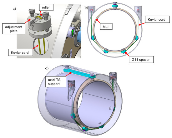 Suspension of the thermal shield on aramid (Kevlar 49) cords: (a) vertical adjustment of the single loop; (b) location of G11 spacers on the circumference of the thermal shield with multilayer insulation (MLI); (c) G11 axial support of the thermal shield segment.