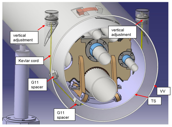 The suspension of the thermal shield was designed in two versions. The first was based on aramid fiber cords (Kevlar 49) with a diameter of 3 mm (Figure 7 and Figure 8). The single cord, in the form of a closed-loop, supports the thermal shield tube by four thermally insulating spacers made of G11 glass fiber laminate to avoid direct thermal contact of the cord and the multilayer insulation (MLI) of the thermal shield. The spacers simultaneously provide 10 mm space for the MLI to avoid its compression. The weight of the thermal shield and all the cold mass inside the thermal shield is distributed among all four spacers and reaction forces are applied to the thermal shield only in the radial direction. The vertical adjustment, shown in Figure 7a, can be used to balance the forces in all the aramid cords along the BPL module during the manufacturing stage.