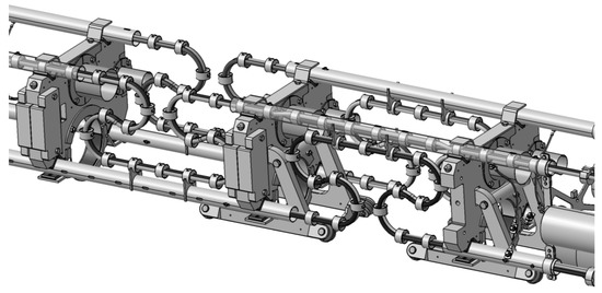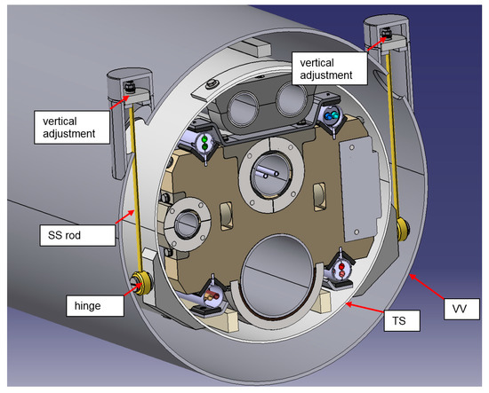 The second concept of the thermal shield suspension is based on the stainless-steel rods instead of aramid cords (Figure 9). A pair of steel rods are attached to the thermal shield by hinges. Because of the significant force and bending moment acting on the TS, the area of connection to TS is strengthened. Upper ends of the rods are supported by the vacuum vessels with the possibility of vertical adjustment. In Figure 10, the cold mass suspension system in the area of magnet connection is shown.