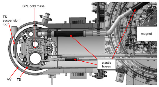 Connection of the BPL cold mass to the magnet in a lateral direction by elastic hoses on process pipes.