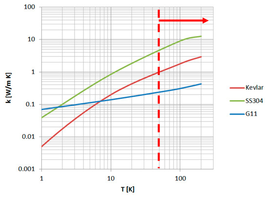 Thermal conductivity of various materials used for cryogenic support and range on thermal shield (TS) support temperatures. Red line shows the operational temperature range.