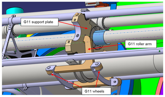 The G11 support plates are supported inside the TS on G11 roller arms equipped with four G11 wheels. The wheels provide sliding support for the G11 plates (Figure 12).